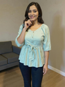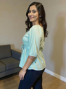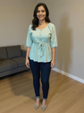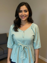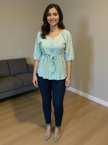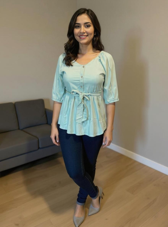 Add a breezy charm to your wardrobe with our elegant Aqua Blue Cotton Peplum Top. Designed with soft cotton fabric, this top features a flattering tie-waist detail, button-down front, and 3/4 puff sleeves for a graceful silhouette. Perfect for casual outings, brunch dates, or daily wear, it pairs effortlessly with jeans, trousers, or skirts. The relaxed fit ensures all-day comfort with a touch of effortless style.