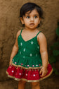 Dress your little one in this adorable handcrafted Bandhani frock, designed with vibrant green and red hues that capture the charm of Rajasthan. Featuring mirror work, gota lace, and hanging coin embellishments, this frock is both stylish and comfortable. The soft cotton fabric ensures all-day comfort for your baby girl while keeping her festive ready.