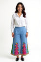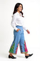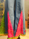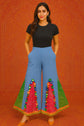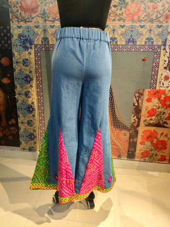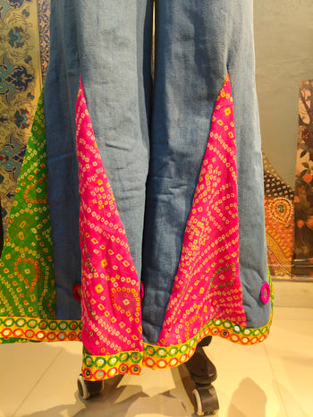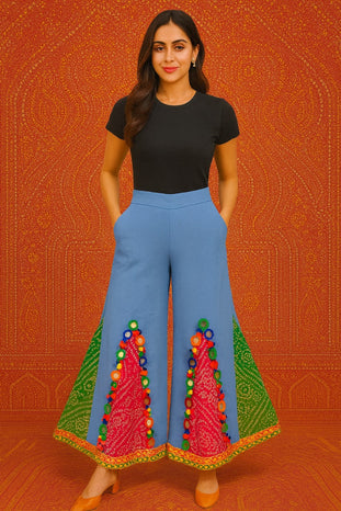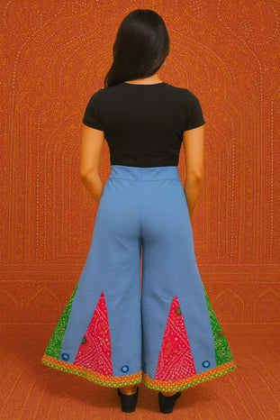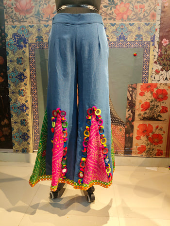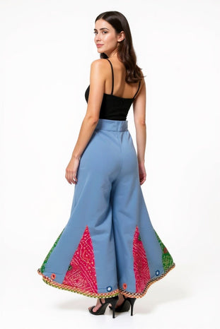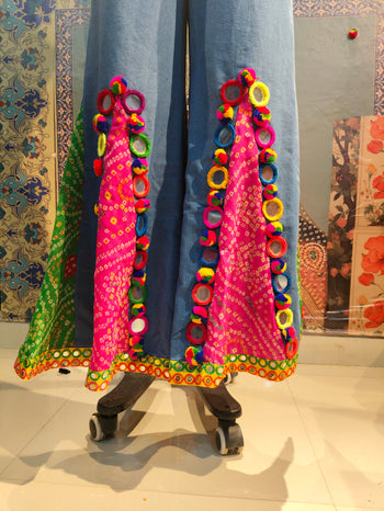 Step into vibrant boho elegance with these handcrafted wide-leg pants. Designed in a soothing sky-blue base, they feature bold bandhani patchwork panels in red and green, highlighted with multicolored mirror-work appliqué and playful fabric tassels. The wide flare adds dramatic movement, while the pockets ensure everyday comfort.