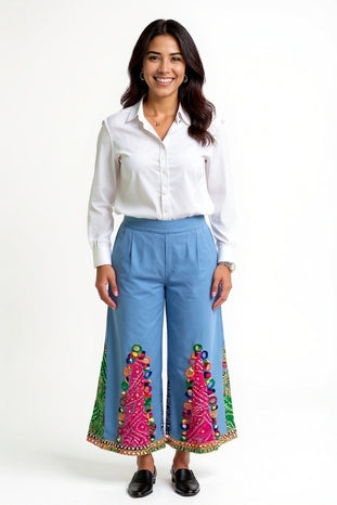 Perfect for styling with a plain top for casual outings or elevating with a statement blouse for festive occasions, these pants bring a fusion of traditional artistry and contemporary cuts.