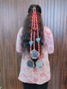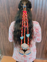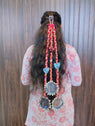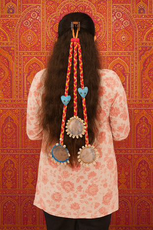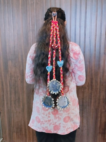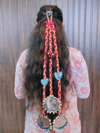 Elevate your festive look with our handcrafted Boho Hair Accessories, designed to bring a touch of tradition with a modern bohemian twist. Featuring vibrant braided fabric strands, adorned with hand-painted beads, heart charms, and cowrie shell-framed mirror work, this accessory is perfect for Navratri, weddings, or cultural celebrations.