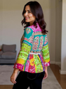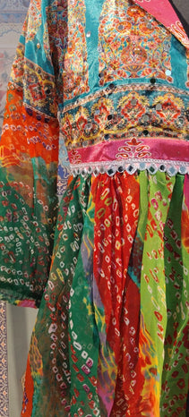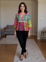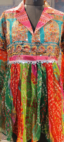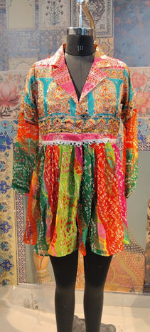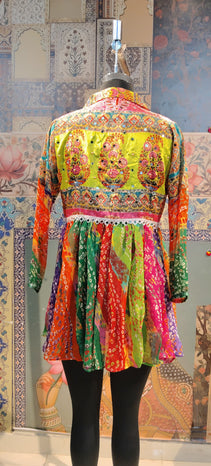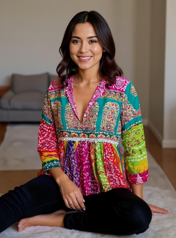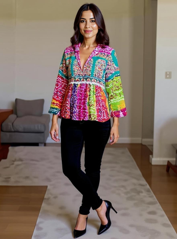Unleash your inner free spirit with this stunning multicolor boho-style peplum kurti. Expertly handcrafted with traditional mirror work and patch-style prints, this top is a celebration of Indian artisan heritage. Designed in soft, breathable cotton with flared pleats and a deep V-neck, it adds a playful twist to your everyday or festive wardrobe. Style it with jeans, skirts, or palazzos for a fusion-ready look that stands out with every wear.