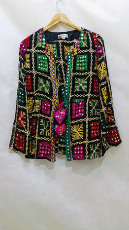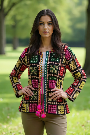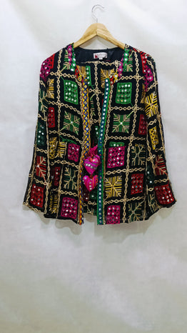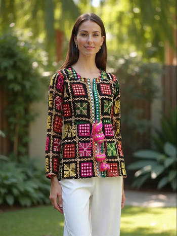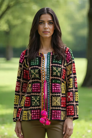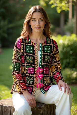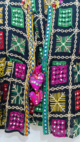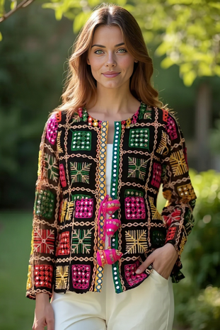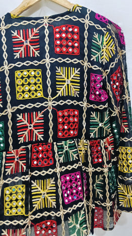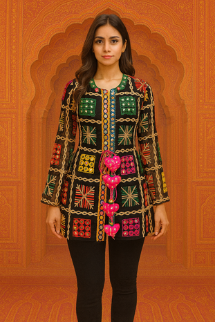 Add a touch of vibrant tradition to your wardrobe with this Boho Phulkari Kurti, featuring intricate multicolor embroidery and mirror work on a rich black base. Handcrafted with precision, this kurti is inspired by Rajasthani and Punjabi Phulkari art, making it a unique fusion of heritage and modern fashion.
