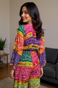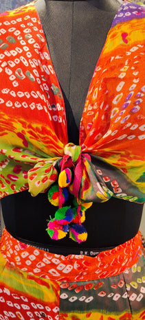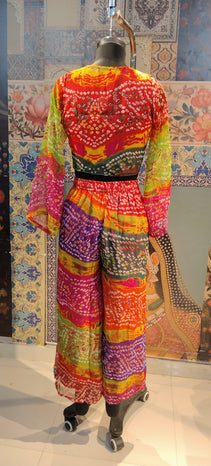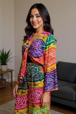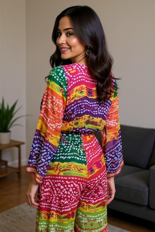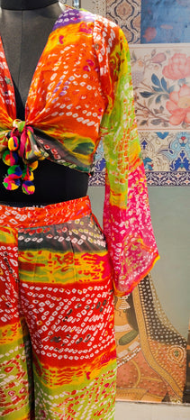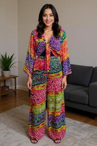 Turn heads with our vibrant Bohemian Bandhani Co-ord Set! This eye-catching ensemble features a front-knot tie-up crop top with flared sleeves and matching wide-leg pants, all adorned in multicolor traditional Bandhani-inspired prints. Crafted in soft, breathable fabric—perfect for summer days, festive evenings, or that next vacation escape. Flaunt your free spirit with effortless grace.