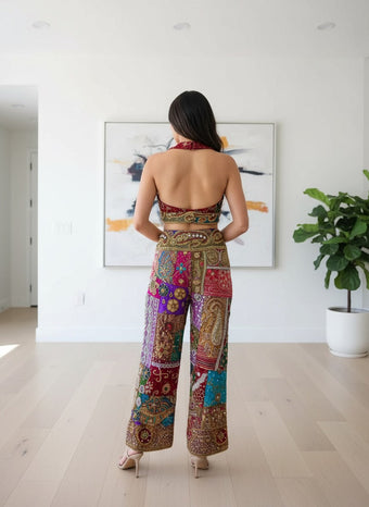 Bottoms: High-waisted wide-leg pants crafted in multicolored embroidered velvet patchwork, featuring rich mirror work, thread detailing, and ornate embellishments.