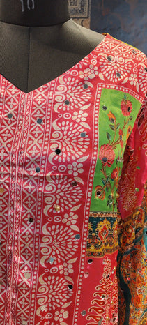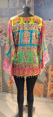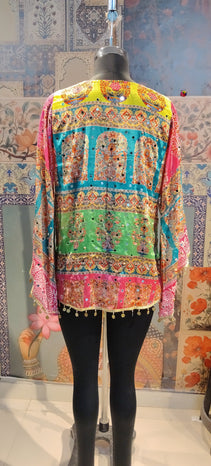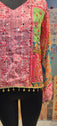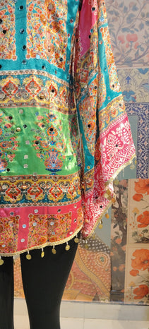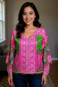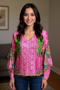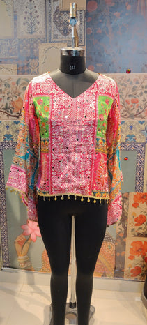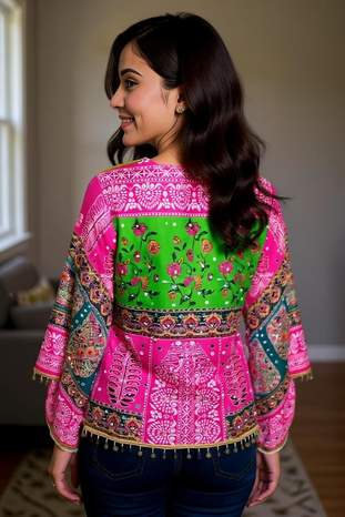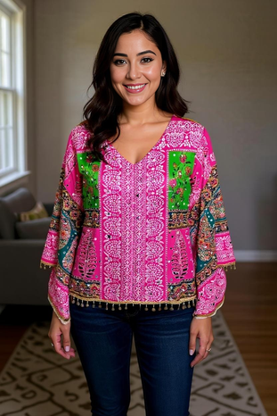 Turn heads in our Gulabi Fusion Boho Top – a vibrant blend of traditional prints and modern flair. Crafted from soft, breathable fabric, this top features intricate Indian motifs, eye-catching patchwork in green and teal accents, and delicate tassel detailing along the hem. The relaxed fit and 3/4th sleeves make it perfect for casual brunches, festive gatherings, or travel looks. Pair it with denim, palazzos, or skirts to complete your chic boho vibe.