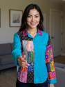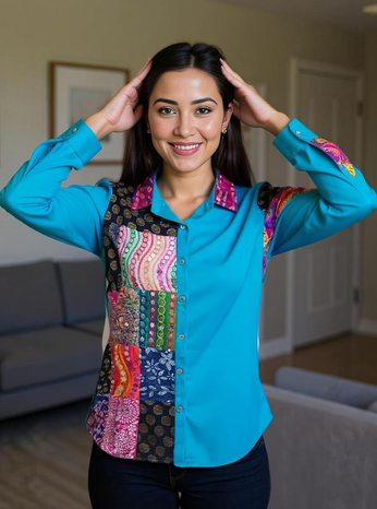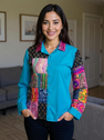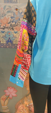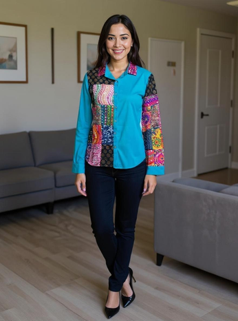 Unleash your inner boho queen with our handcrafted Turquoise Patchwork Shirt, a statement fusion piece that blends traditional Indian textile art with contemporary style. This shirt features colorful patchwork panels made from assorted fabrics, giving each piece a unique identity. With full sleeves and a button-down design, it’s perfect for pairing with jeans, skirts, or shorts for an elevated everyday look.