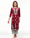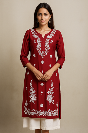 Turn heads with the timeless elegance of the GulMogra Maroon Embroidered Kurti. Crafted from premium fabric in a rich maroon hue, this kurta is adorned with intricate white thread floral embroidery, creating a beautiful contrast and a regal look.