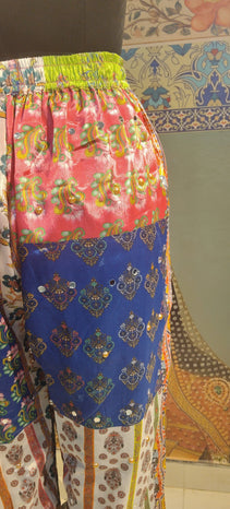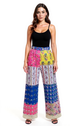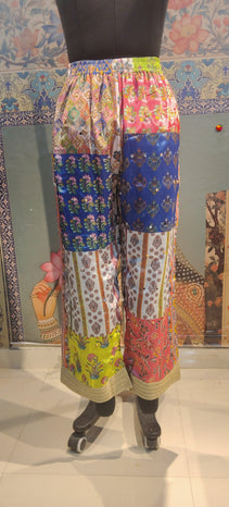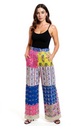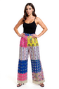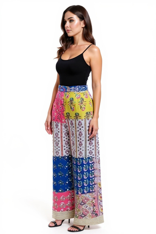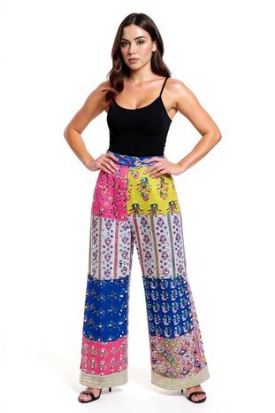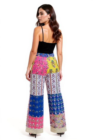 Step into effortless style with these Multicolor Boho Fusion Wide-Leg Pants from Rajni Collection. Crafted with a vibrant patchwork of prints in bold hues of pink, yellow, and blue, these pants perfectly blend modern chic and traditional artistry.